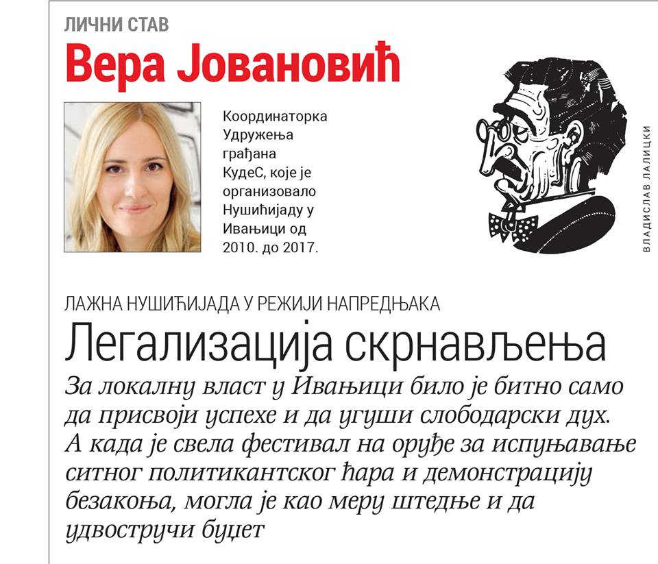 Kada je predsednik opštine Ivanjice krajem marta objavio da KudeS „nema više nikakve ingerencije u učešću na Nušićijadi”, bilo je jasno da se radi o otimanju. Pred strašću žetve tuđe njive sve je postalo nebitno – i činjenice, i zakon, i ljudi. Nebitna je postala i decenijska setva „novopečenih nušićevaca“, kako nas je Zoran Lazović nazvao, a zatim prognao. I formalna pripadnost festivala KudeS-u. I 4.000 potpisa građana. Bitno je postalo prisvojiti renome i uspehe festivala, ućutkati poneki nekontrolisani glas, ugušiti slobodarski duh i iskoristiti ogromni potencijal festivala za političku manipulaciju. Sasvim očekivano, lokalna vlast svela ga je na oruđe za ispunjavanje sitnog politikantskog ćara i demonstraciju bezakonja.